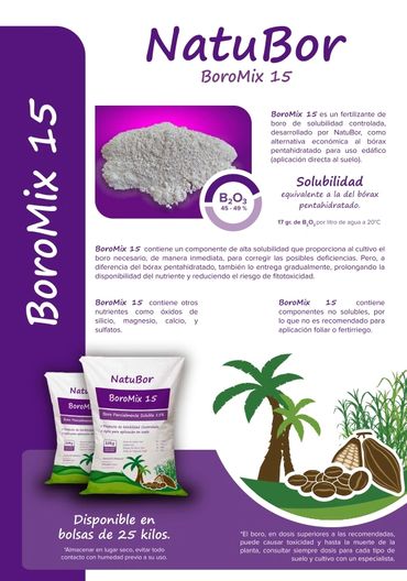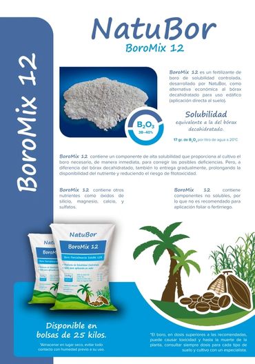 BOROMIX es una línea de fertilizantes de boro de solubilidad mixta, conteniendo componentes de alta solubilidad para aportar a la planta una primera dosis del nutriente de absorción inmediata, y componentes de solubilidad media que aseguran la disponibilidad de boro durante periodos más prolongados de tiempo. BOROMIX está disponible en concentraciones de 12% boro y 15% boro. BOROMIX tiene como peculiaridad que la solubilidad puede ajustarse a necesidades específicas de suelo, cultivo o deficiencia de boro.
